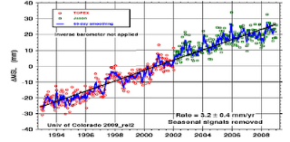 Strike two. (The vertical axis is in 1022 Joule increments). The ocean temperatures have cooled as well. AN opponent might argue that these numbers are contrived to prove “our” point. No, this data set is from over 3000 automated bathythermograph buoys deployed throughout the world’s oceans. While we’re talking about the oceans, remember the dire predictions that we’ll experience flooding of 20 to 250 feet (depending on which scaremonger you listen to)?? Well, that’s not really happening either:
