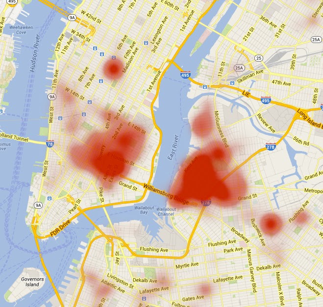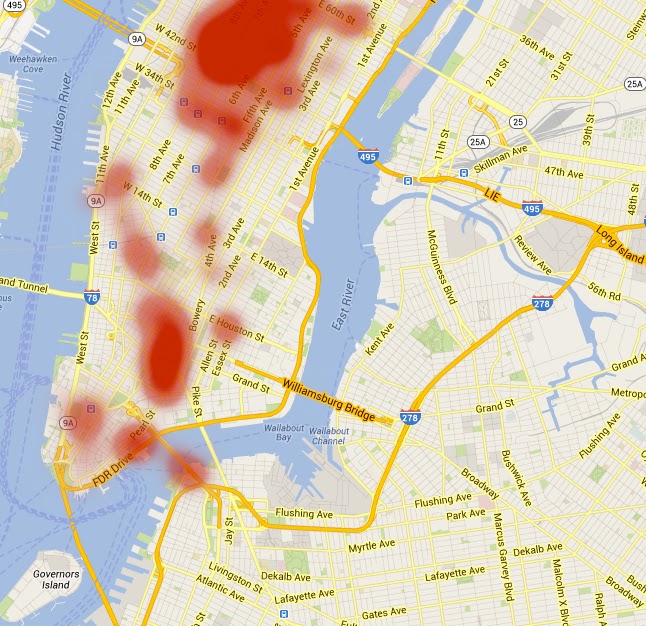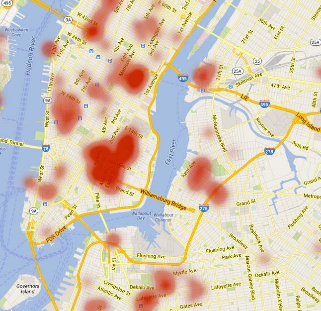 New York, which is a much more socially segregated city (meaning all the separate sections of Manhattan, different neighborhoods in Queens and Brooklyn strike Dr. J. as post Milosevich Yugoslavia), really gives some different heat-maps.