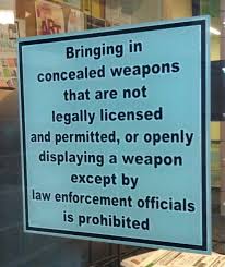 For example, a store owner can take the official 4″ x 6″ sign and put it on a larger poster board, along with all sorts of stuff around it (store hours, website address, whatever). As long as the official sign is present (and per usual in an easily seen space near the entrance), the sign is valid. Anyone bringing a firearm past that sign is asking for trouble.