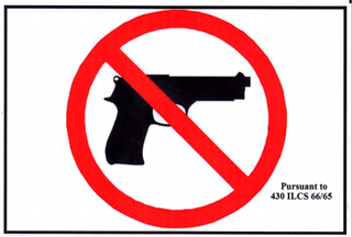 Anyway, he wishes us all to note that Illinois law does permit a property owner to incorporate the legal requierments of the signage within a larger display or context. In other words, you can put the 4″ x 6″ sign within a much larger sign. Yes, the 4″ x 6″ requirements must still be met, but a concealed carrier must recognize that just because the sign itself is larger than the requirement does not mean the sign is invalid.